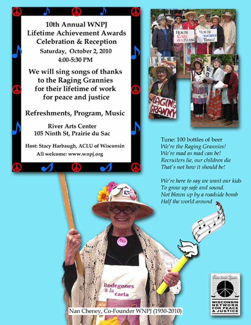 | Oct. 3 | Awards ceremony at WNPJ Annual Assembly in Madison. Hear Take Me Out of the War Game (2 MB MP3) and see 40 second QuickTime video clip of rehearsal (21 MB MOV). |